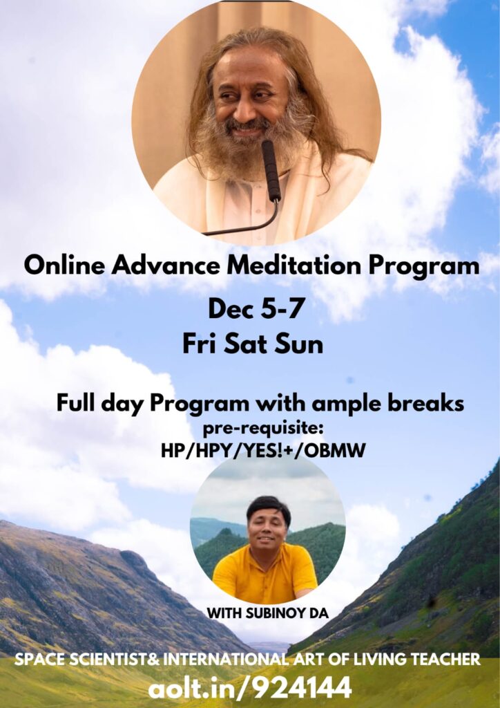 Online Advanced Meditation Program with Dr Subinoy Das Dates: 5 to 7 December 2025Fri Sat SunFull day Program with ample breaks Register
